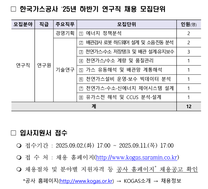 아래와 같이 한국가스공사에서 2025년도 하반기 연구직 채용을 진행합니다.